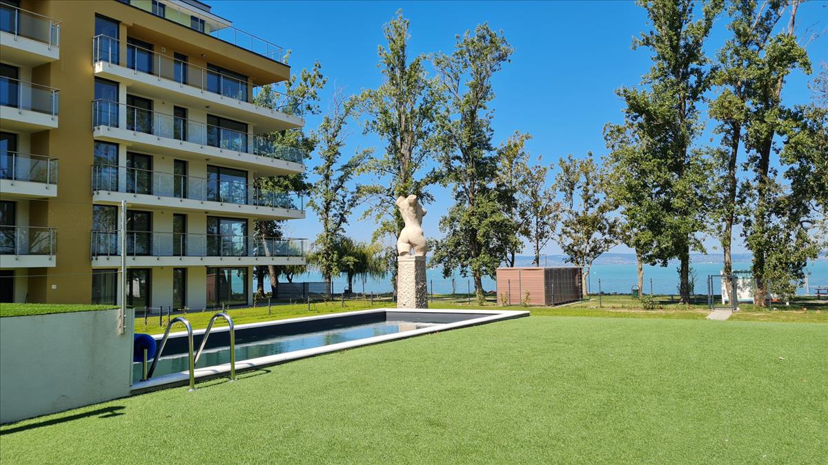 Az ötemeletes apartmanház közvetlenül a Balaton partra (szabadstrand) épült,