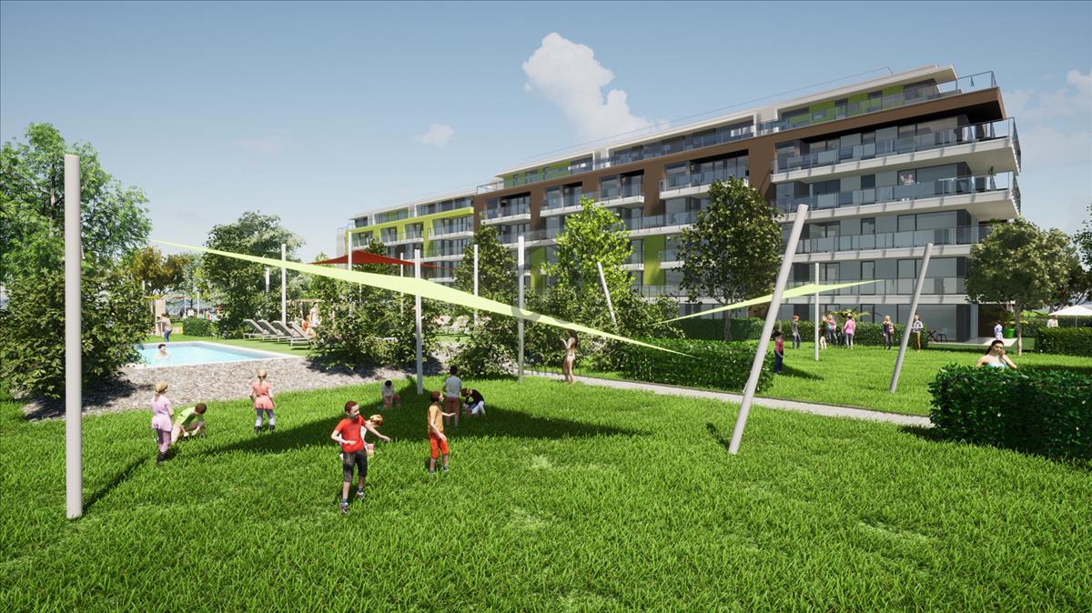 A telken található két új építésű társasház lakói kizárólagos kerthasználatot kapnak a helyszínrajzon megjelölt területre, ahol a több generációs családok kikapcsolódása érdekében, a beruházás keretein belül gyermekjátszóteret és kültéri medencéket biztosítunk ezen két társasház tulajdonosai számára.