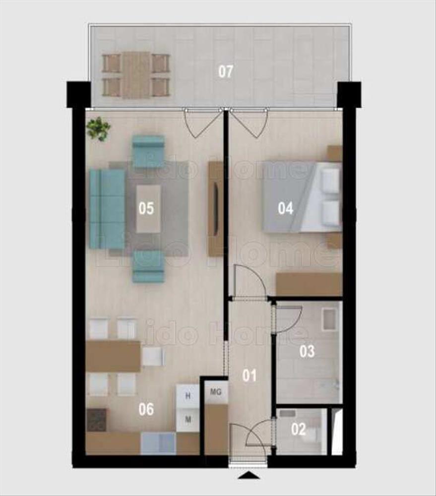 - Helyiségek: Nappali-konyha-étkező: 29 m2; Hálószoba: 13, 5 m2; Előtér: 6 m2; Fürdőszoba: 4, 5 m2; wc: 1, 5 m2