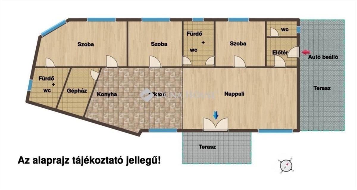 Elosztása: Nappali, konyha, étkező, 3 szoba, 2 fürdőszoba + wc, külön wc, előtér, gépészet.