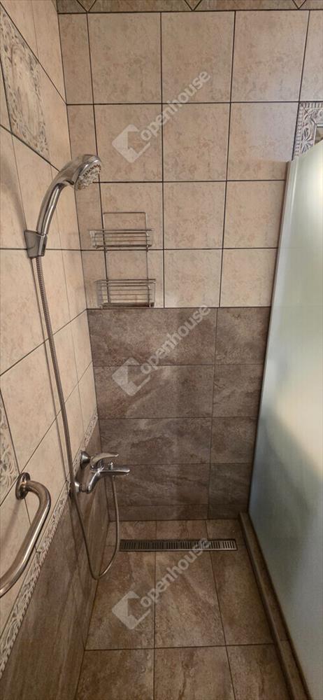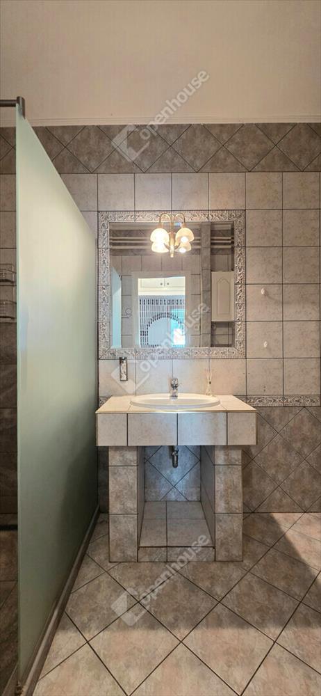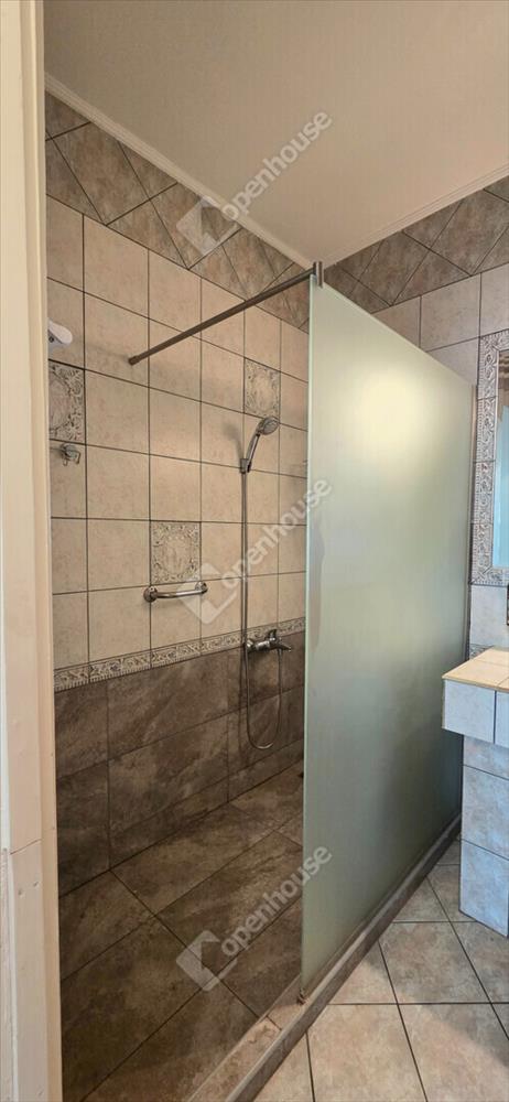 Másik különlegessége a lakásnak a fürdőszoba, amelyben szintén elegáns és egyedi beépített elemeket fedezhetünk fel mint az épített mosdó állvány, beépített díszkeretes tükör, a füstüveggel elválasztott tágas tusoló és a dekor csempével burkolt falak.