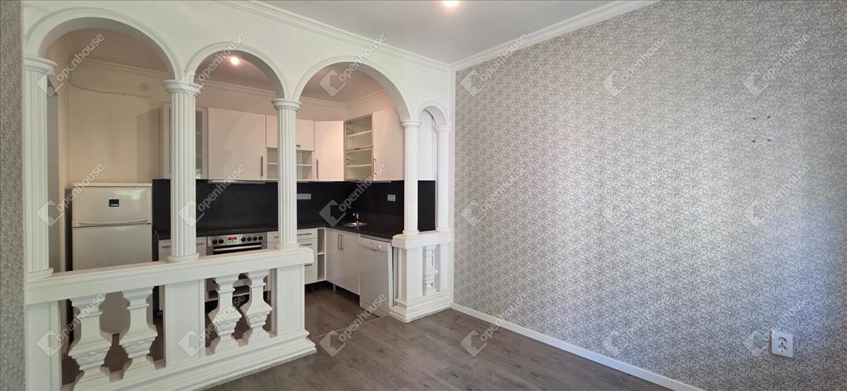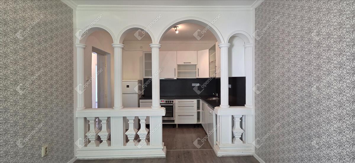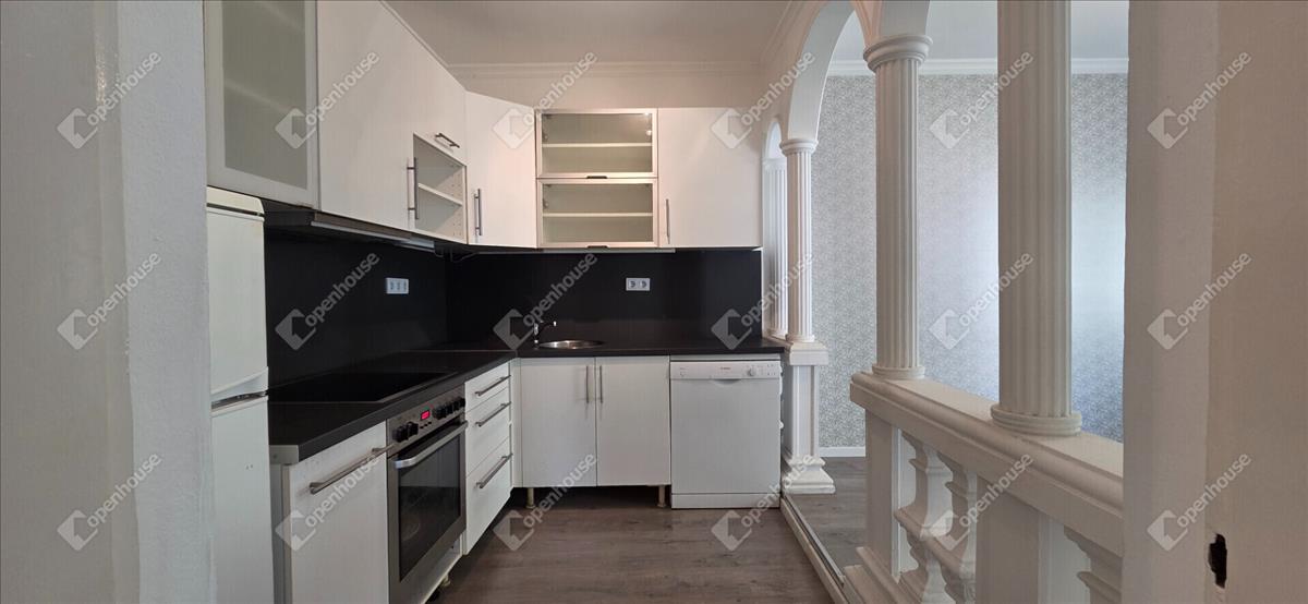 A konyha - étkezőt egyedi design, különleges megoldások jellemzik, mint a beépített és gépiesített modern konyhabútor sötét munkapulttal és világos bútorokkal, minőségi laminált parkettával. Klasszikus stílusú, dekoratív beltéri boltív, gipszstukkó, korinthoszi jellegű oszlopok és ballusztrádos korlát választja el egymástól a két teret. Az étkező hangulatát fokozza a két oldalfalát védő dekor tapéta, amelynek színvilágához könnyedén illeszthető bármilyen étkezőgarnitúra, dísznövény és dekoráció.