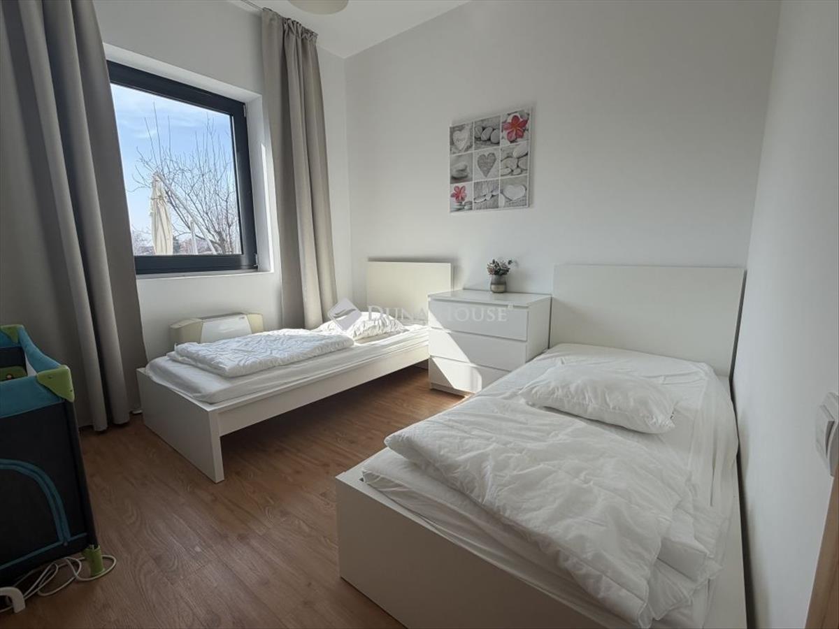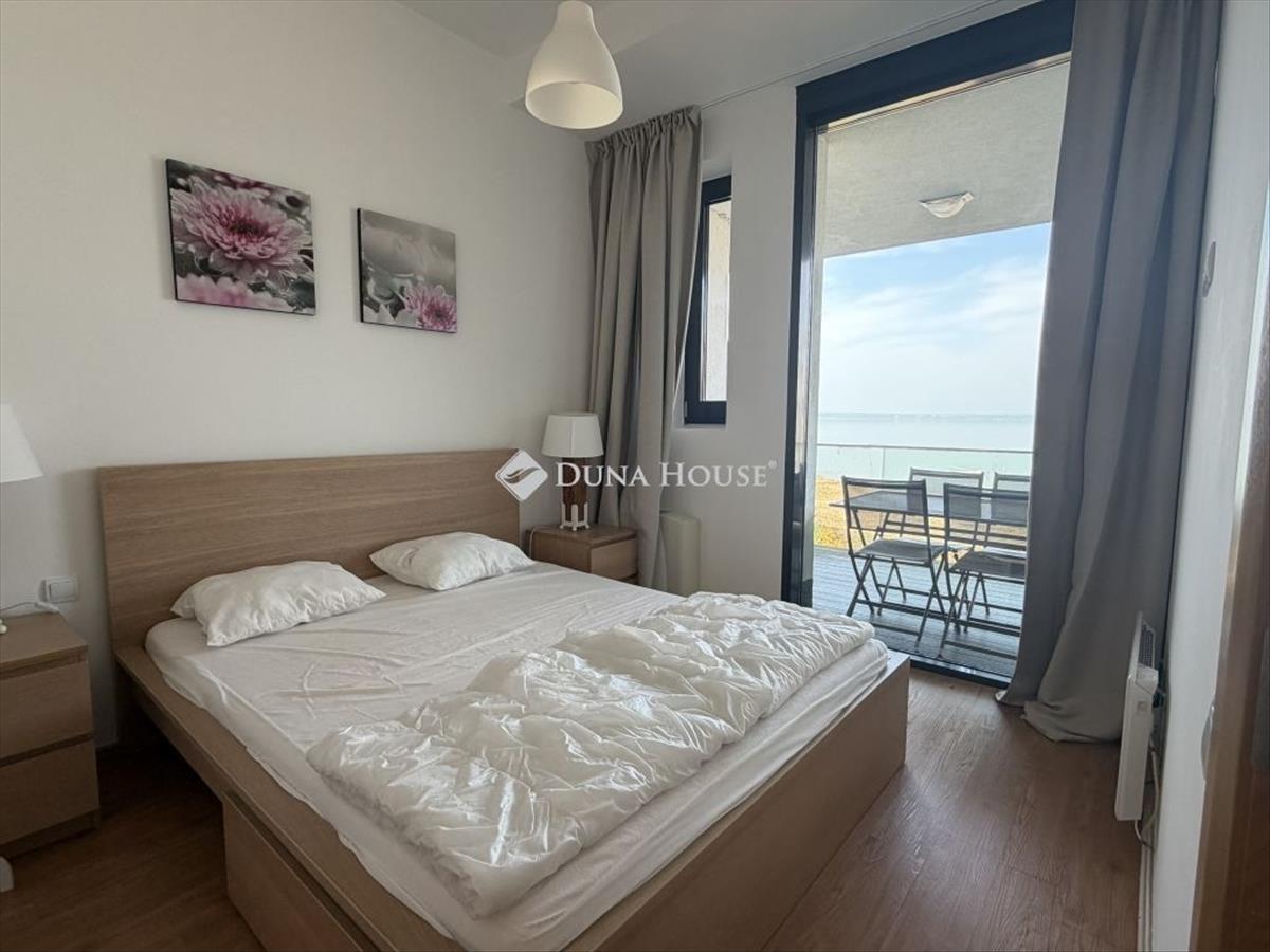 A belső elrendezés praktikus és élhető: a világos nappali közvetlen kijárattal rendelkezik a teraszra és a kertbe, míg a két külön nyíló hálószoba nyugodt, intim életteret biztosít. a nagy üvegfelületeknek köszönhetően a lakás egész nap világos, a balatoni panoráma pedig a mindennapok természetes része.