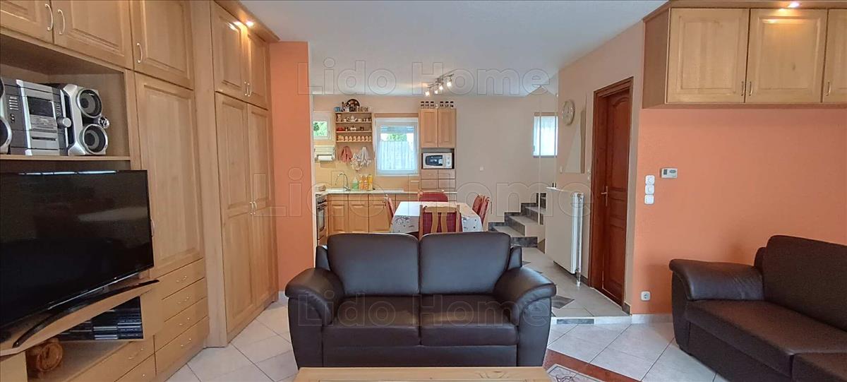 - a középső szinten nagy nappali, konyha-étkező, külön wc kézmosóval és az emeleti szintre felvezető lépcsőfeljáró