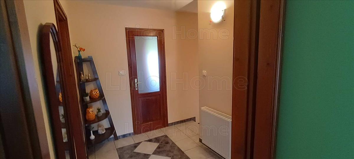 -A földszinten előszoba, kazánház, mosókonyha, és a lakással egybeépített fűtött garázs+tároló található valamint a felfelé ívelő lépcső