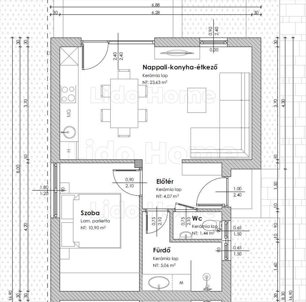 -45 m2 hasznos alapterület + 10 m2 terasz,