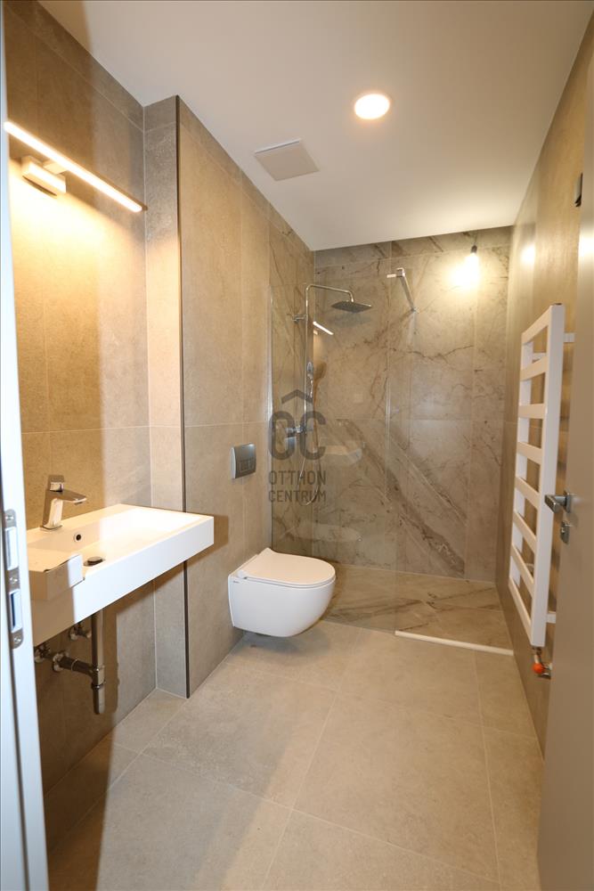 A lakásban található egy fiatalos fürdőszoba, amely a legújabb trendeknek megfelelően lett kialakítva Ravak, Geberit és Radaway szerelvényekkel.