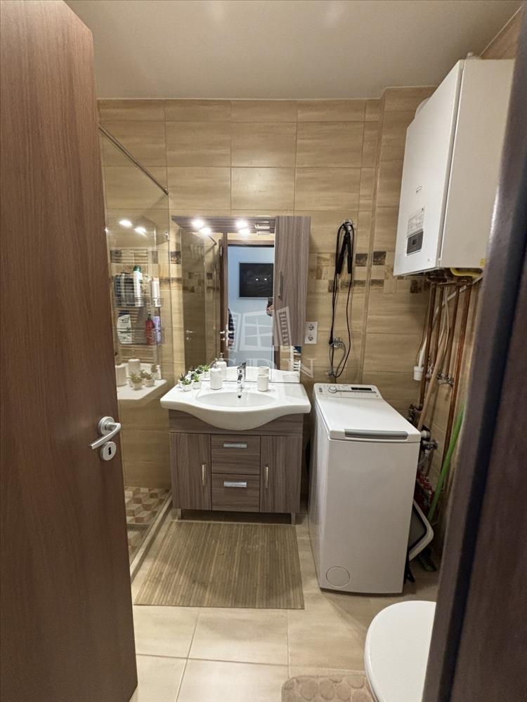 Fürdőszoba épített, üveges tusolóval, törölközőszárító, mosdó, wc