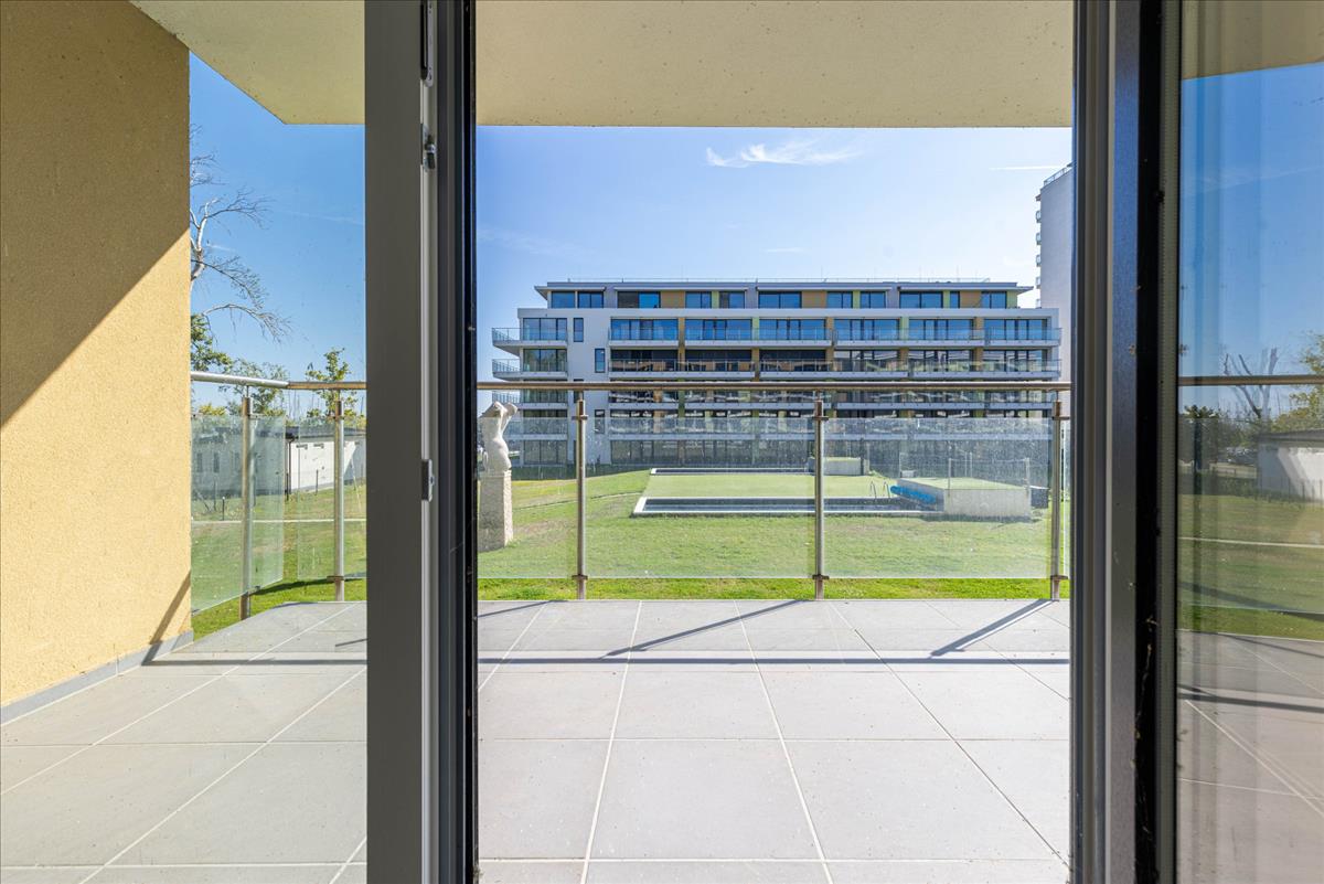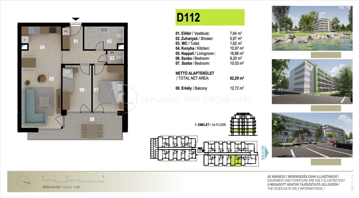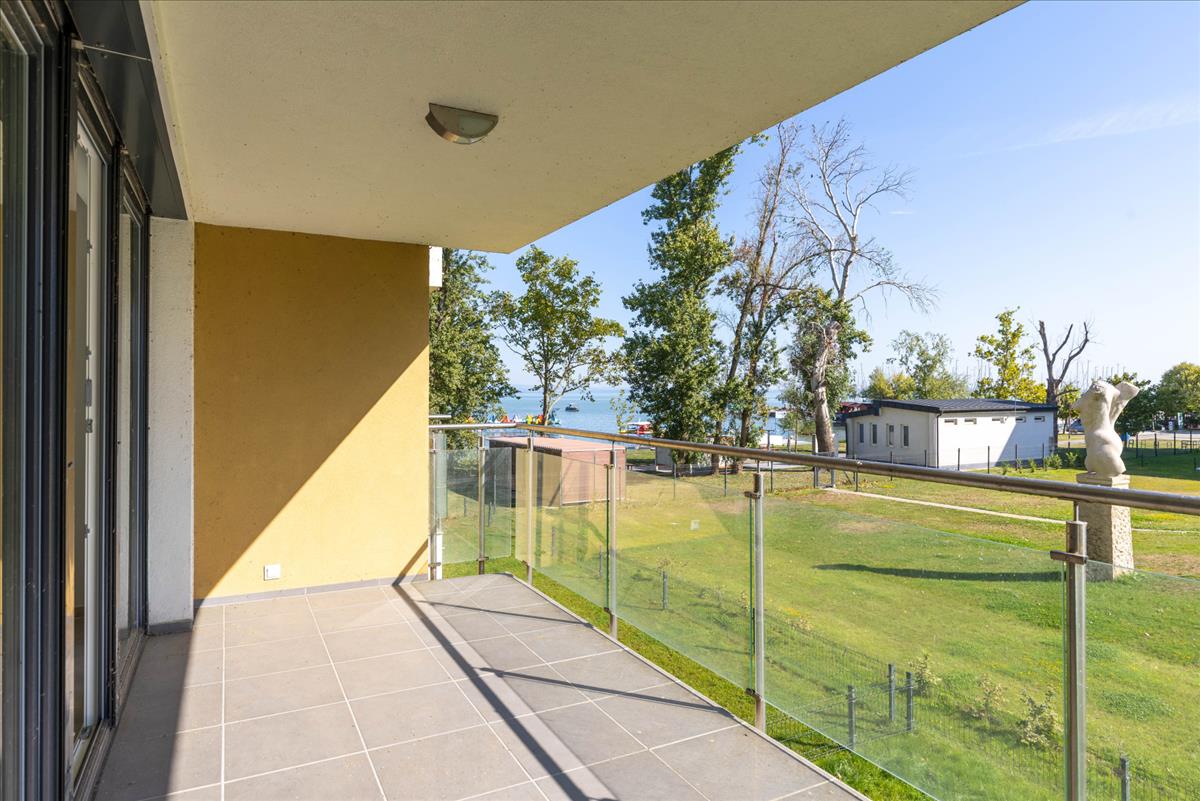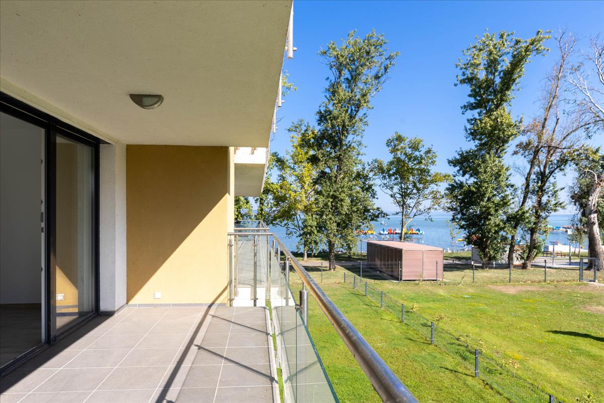 Az ötemeletes apartmanház közvetlenül a Balaton partra (szabadstrand) épült,