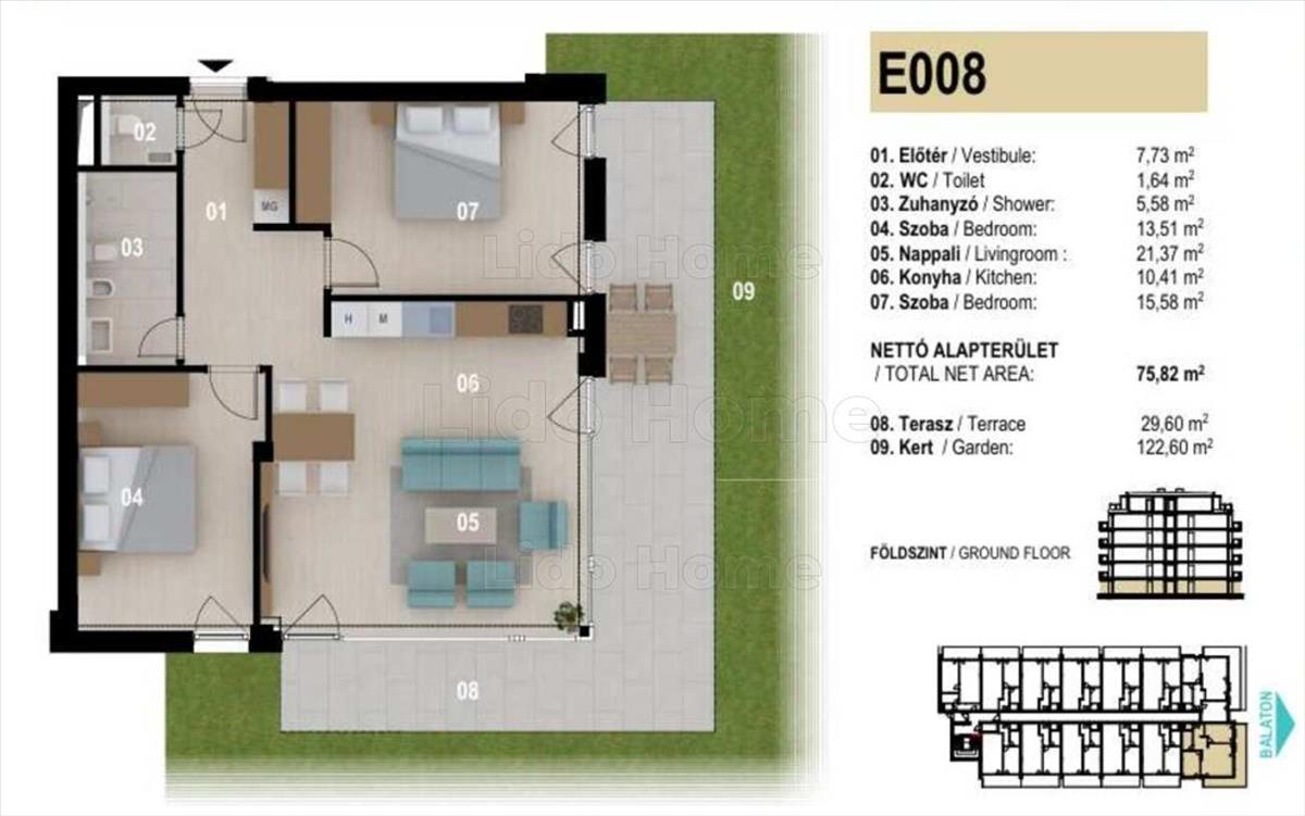 A 71 lakásos lakópark merőleges a Balatonra, ezért minden lakás Balatonra tájolt erkélyéről biztosított lesz az örök PANORÁMA.