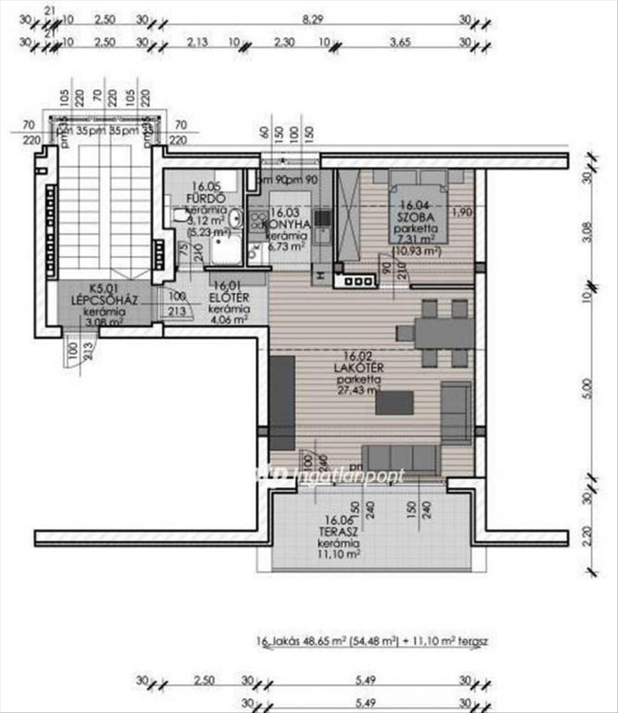 55, 9nm 2 szobás, 11, 41nm terasz. (Terasz fele bele lett számolva az alap nettó nm -be. )
