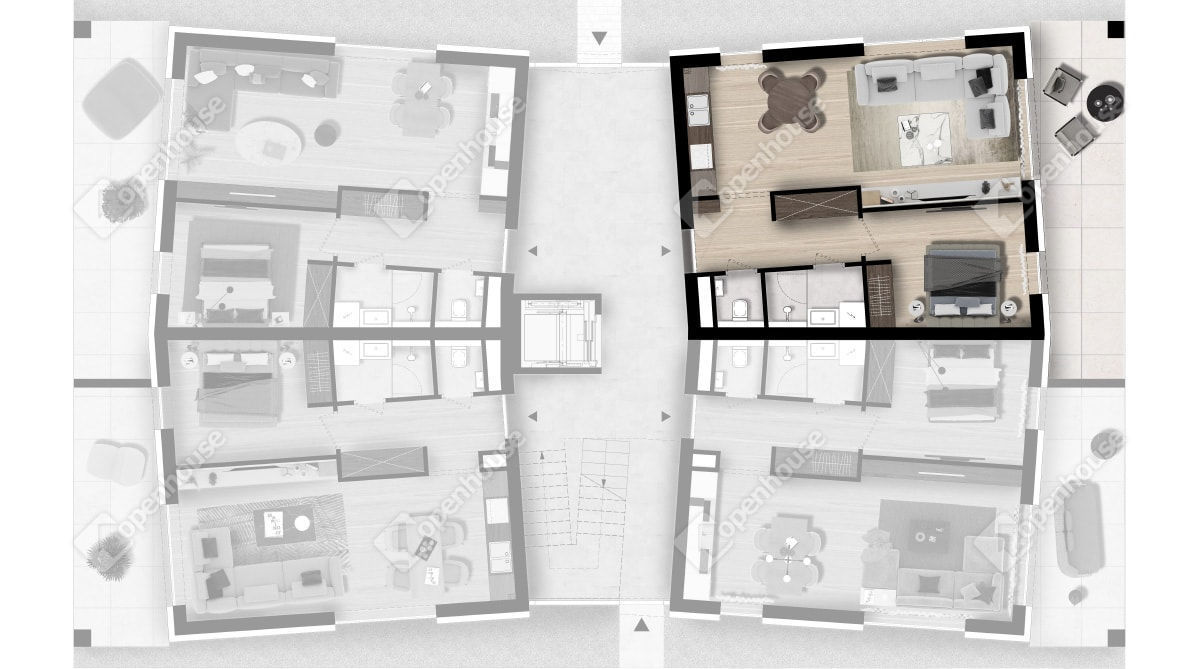 - Burkolatok: a szobákban és a konyha-étkező-nappalikban laminált padló, a fürdőkben és a WC-kben kerámia, a többi helyiségben gres lapburkolat készül. Az erkélyek burkolata fagyálló greslap, a teraszokra bazaltzúzalékba fektetett greslap kerül nyílthézagos fúgakialakítással