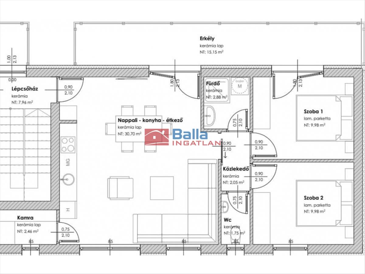 Nettó: 60 m2 /Erkély: 15. 15 m2 / Kert: 0 m2