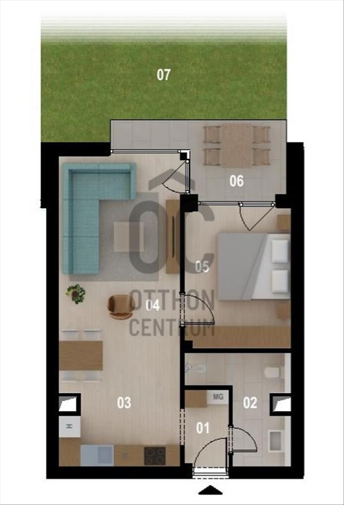 1 háló, nappali, konyha, fürdőszoba +wc, előtér, 7, 34 nm terasz, és 36 nm kertkapcsolat