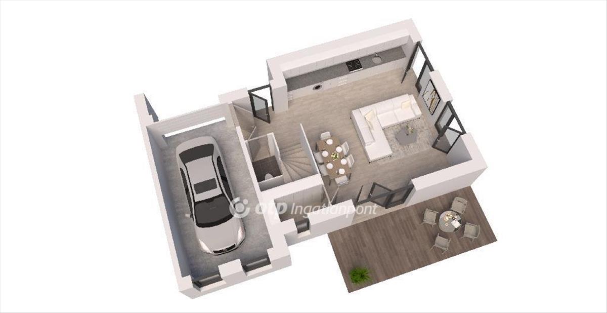Földszint: nappali, konyha-étkező, fürdő, garázs, fedett terasz kertkapcsolattal