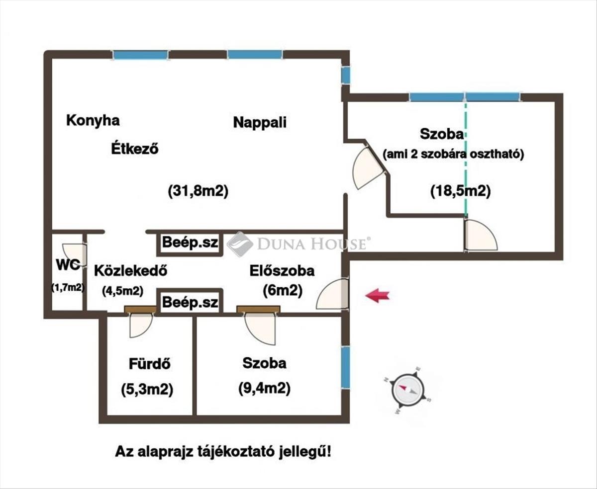 Elrendezése: amerikai nappali - konyha - étkező, hálószoba gardróbbal, egy 18, 5m2-es (gyerek) szoba, ami könnyedén két szobássá visszaalakítható, továbbá előszoba, közlekedő, fürdőszoba káddal és zuhanyozóval, és külön WC.