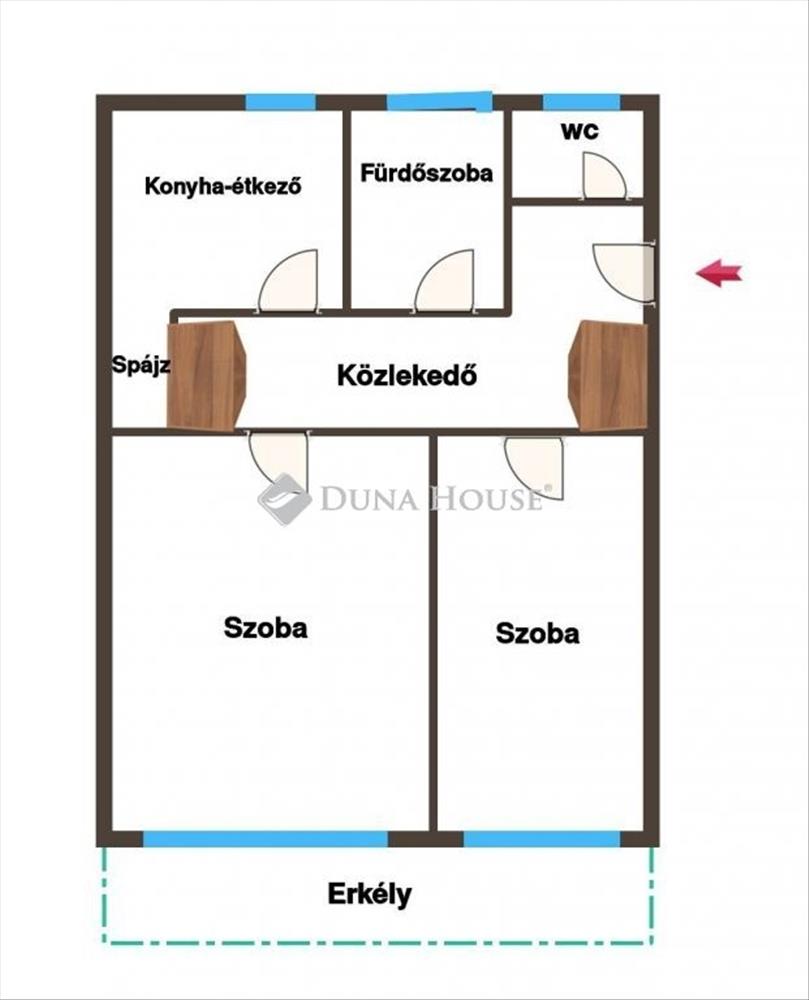 Elrendezése: előszoba, közlekedő, külön wc, fürdőszoba, két szoba, konyha és spájz.