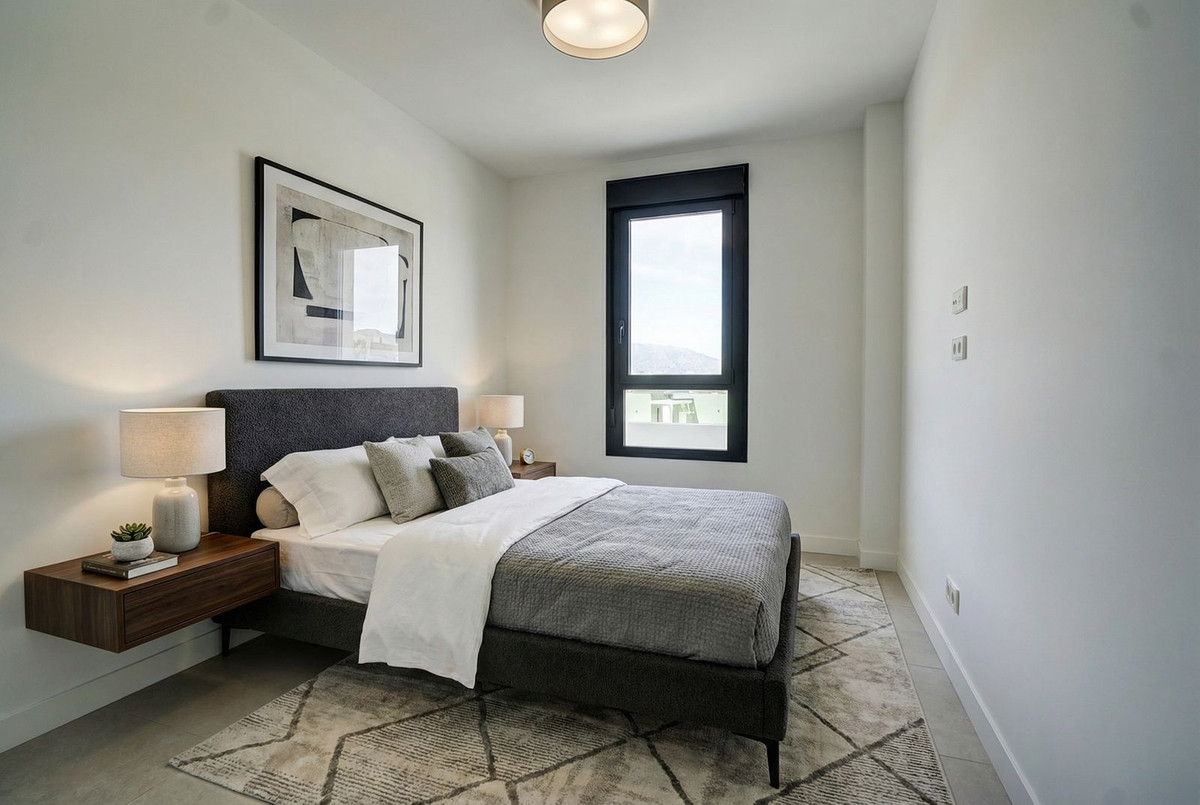 Belül, az ingatlan egy világos, modern open- terv design tágas nappali és teljesen felszerelt konyha, kiváló minőségű készülékekkel. a nagy tolóajtók zökkenőmentesen csatlakoztatják a belső teraszt, maximalizálva a természetes fényt és a kültéri életet. a hálószobában van egy ensuite fürdőszoba és közvetlen hozzáférést biztosít a teraszon, míg minden hálószobában felszerelt szekrények és elegáns befejezések, mint például a large- format porcelán padló. Az apartman is előnyös két teljes fürdőszoba és egy hatékony meleg és hideg légkondicionáló rendszer.