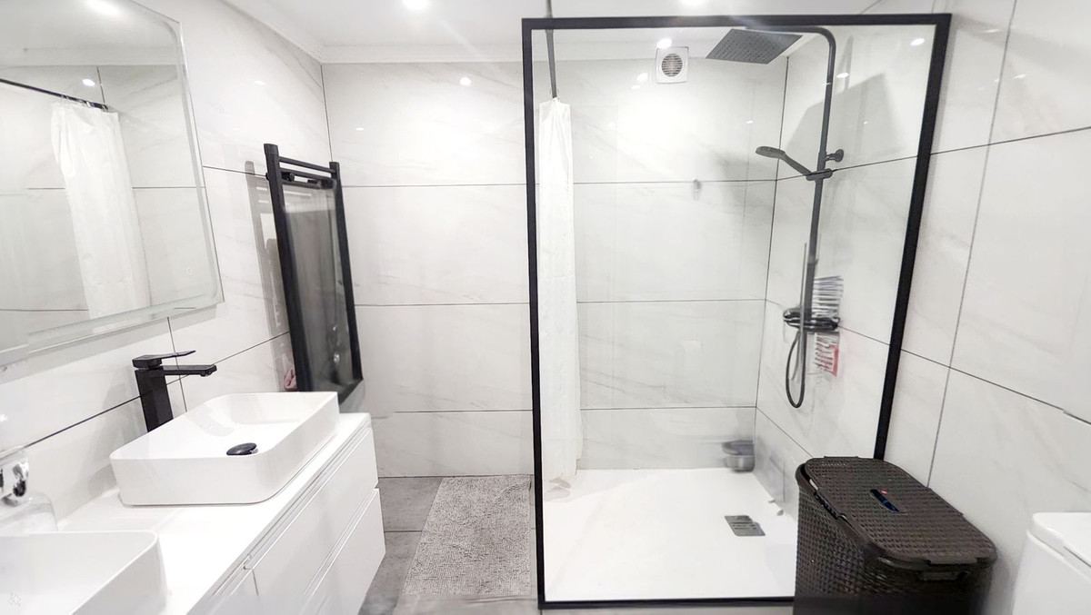 Upstairs 2 large fully reformed medrooms with ample Trastering és Wardrobe Space. a mester megint elképesztő képekkel. a kettő között van egy üveges leszállóhely, ami ismét egy teljesen felújított fürdőszobához vezet, ahol Walk van a Shower-ben és az Intelligent Miror-ban. Forró és hideg levegő.