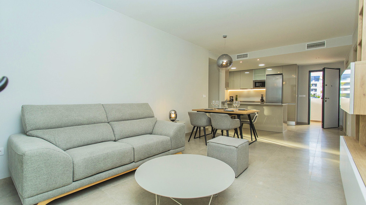 Tágas földszinti apartman nagy terasszal az exkluzív Flamenca Village fejlesztés. Két hálószoba és két fürdőszoba, egy élő-étkező nyitott konyhával. Eladó bútorozott és az apartman tartalmaz egy földalatti parkoló plusz 1 parkolóhely a vendégek számára a komplexum. a 3. Szakasz 2023-ban épült, és az ingatlant soha nem használták, vagyis gyakorlatilag új építménynek tekintik.Központi légkondicionáló, modern konyha minden top márka készülékek, designer bútorok, nagy terasz, hogy élvezze a mediterrán éghajlat.