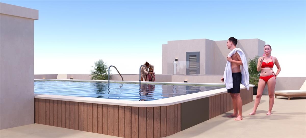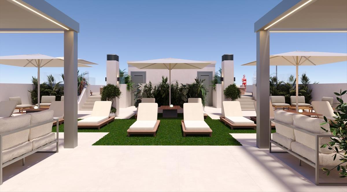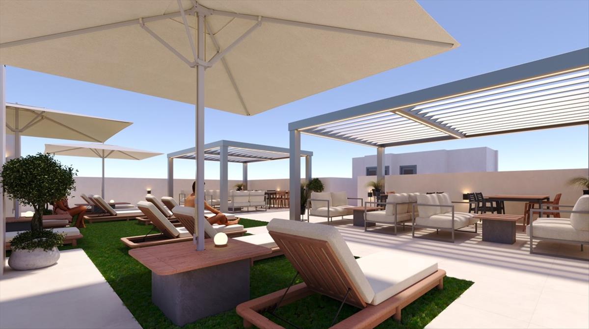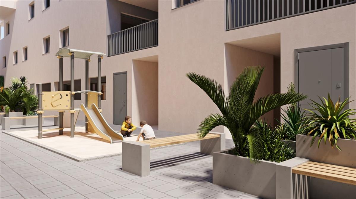 A földszinti közösségi terület parkosított kertből, ülősarokból, kerékpártárolóból és játszótérből áll. a tetőn közös medence, pergolák, napozóágyak és árnyékos terület található.