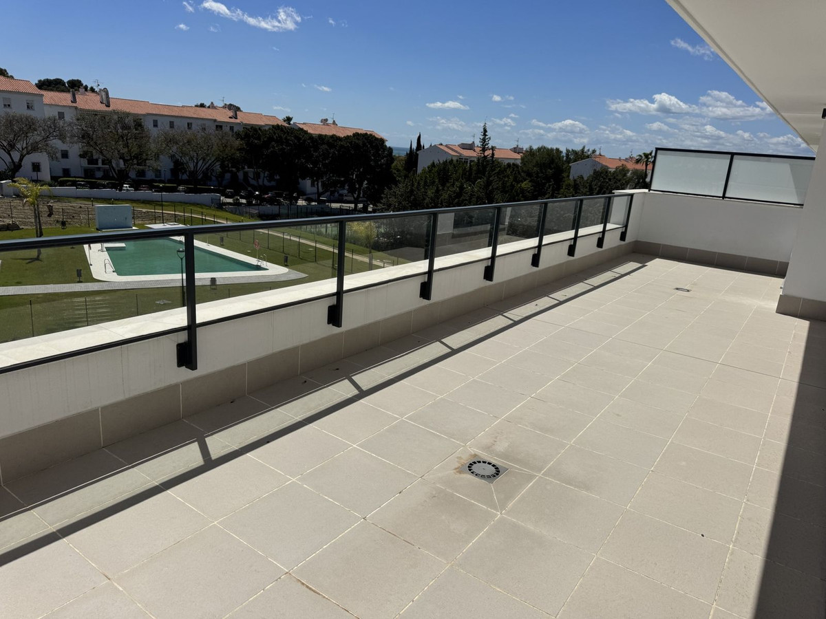 A penthouse modern design és kiváló minőségű anyagokat és befejezéseket kínál. a nyílt terű nappali teljesen felszerelt konyha néz ki egy nagy terasz kilátással a kertre és a medencére. a penthouse áll egy parkolóhely és egy tároló szoba, benne van az árban.