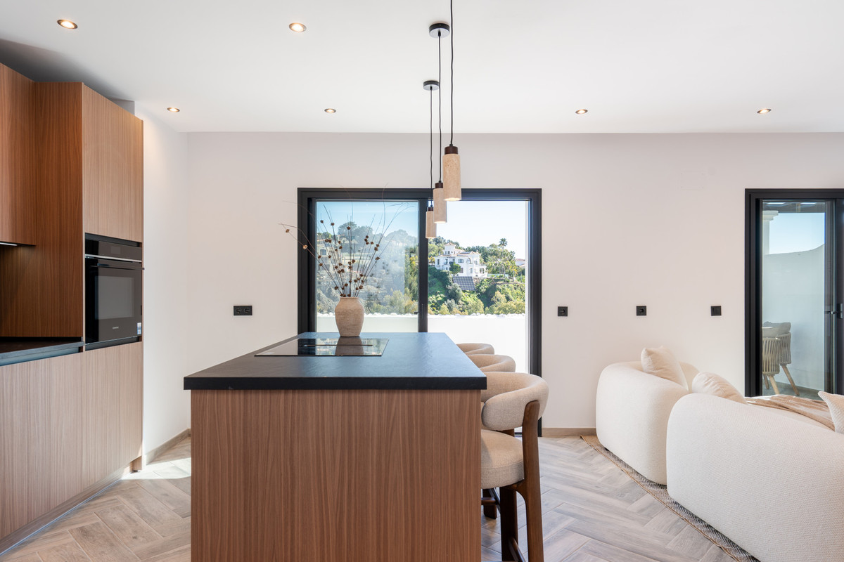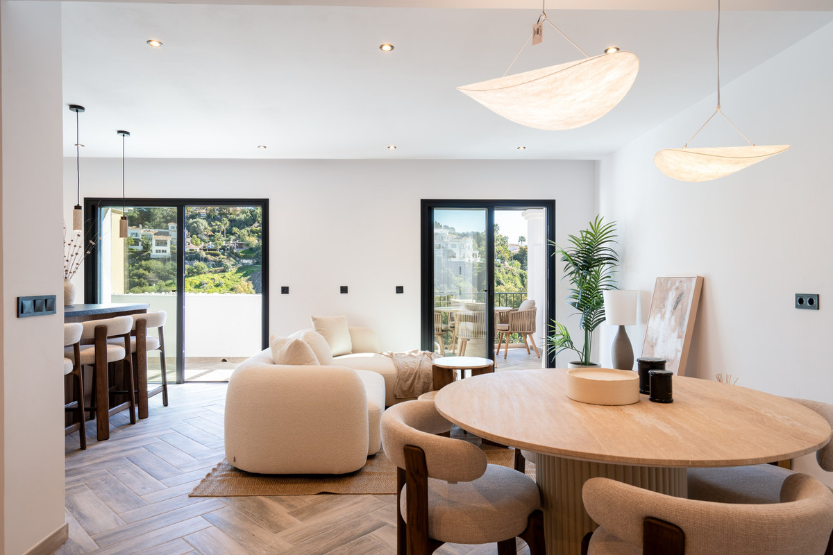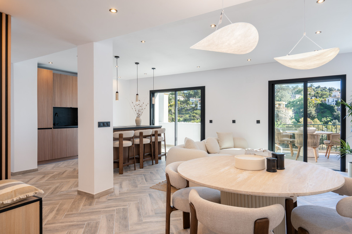 A tágas, teljesen felújított terasz a társalgóból és a főlakosztályból egyaránt, lélegzetelállító panorámás kilátással a Golf-völgyre, a Földközi-tengerre és az ikonikus La Concha hegyre.