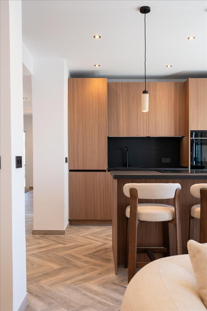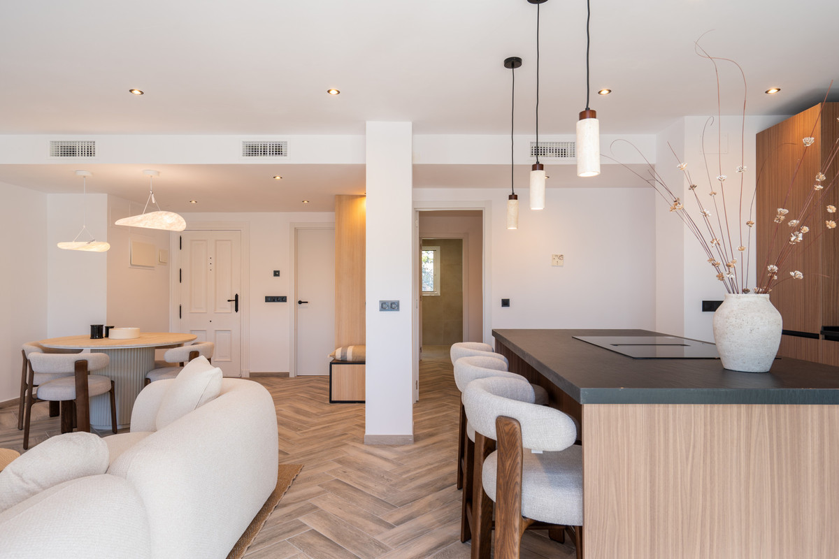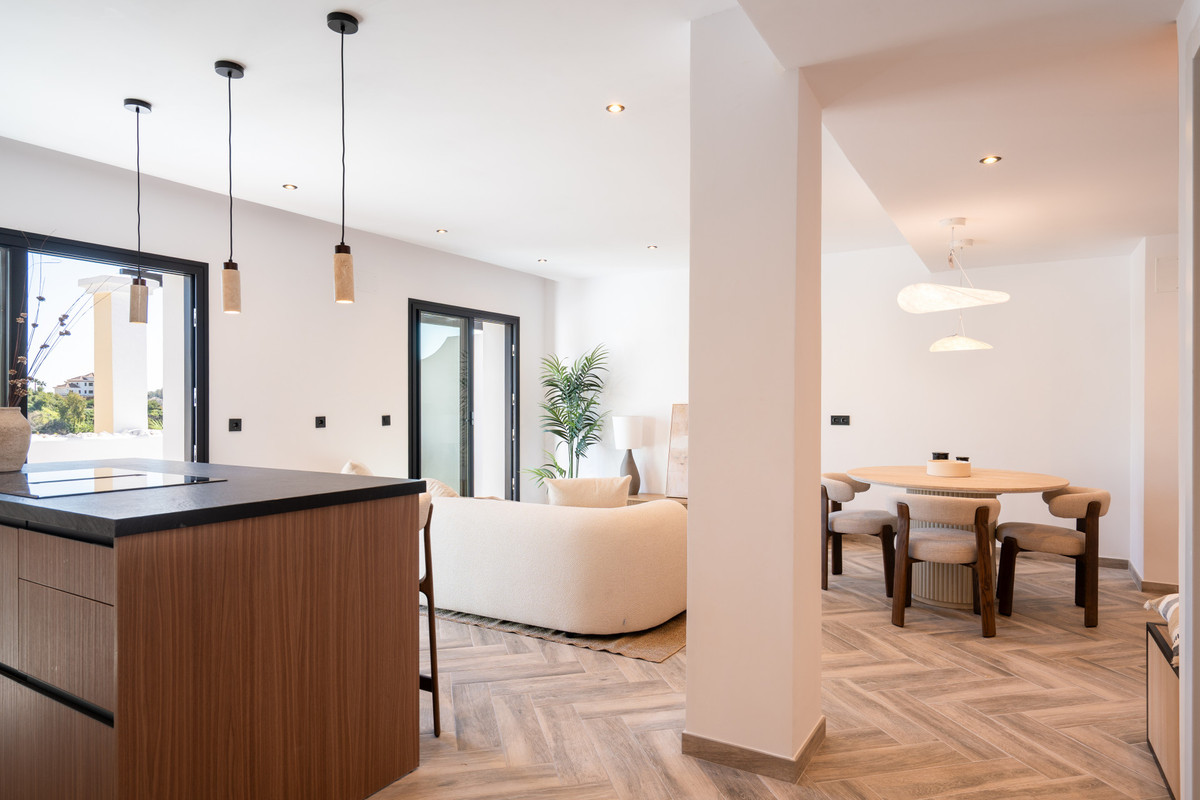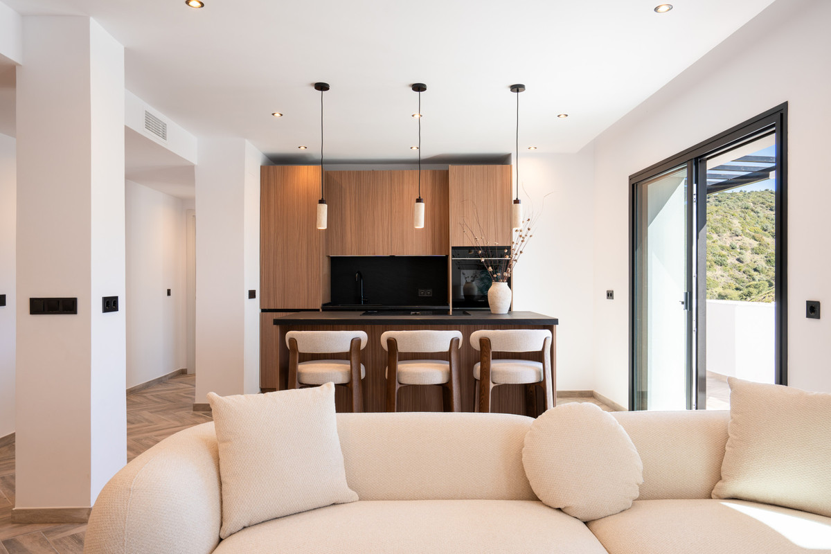 A tágas, teljesen felújított terasz a társalgóból és a főlakosztályból egyaránt, lélegzetelállító panorámás kilátással a Golf-völgyre, a Földközi-tengerre és az ikonikus La Concha hegyre.