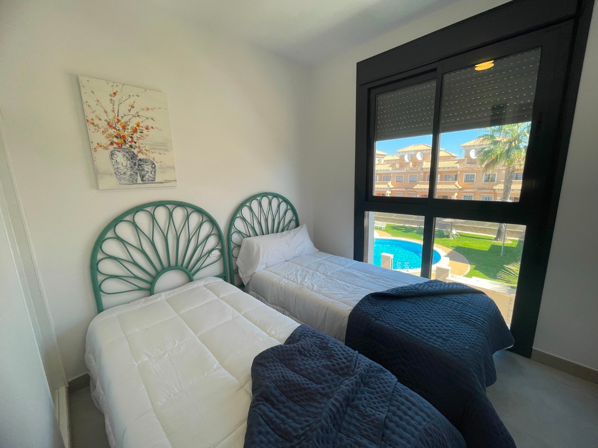 Ez a South Facing, Two Bedroom, Top Floor Corner Apartment található egy 10 perces sétára egy fő lánc szupermarket, jysk bútorbolt, és választéka kávézók és éttermek. Villamartin Golf pálya mindössze 5 perces autóútra, míg a népszerű La Zenia Boulevard bevásárlóközpont és a gyönyörű strandok az Orihuela Costa mindössze 10 perc autóval. Épült 2023-ban, ez a stílusos első emeleti apartman büszkélkedhet egy modern design és világos belső. a nyílt terű lakótér kettős tolóajtókkal rendelkezik, melyek egy részben fedett teraszra vezetnek, kilátással a gyönyörűen kialakított medencére. és nbsp; a tágas felszerelt konyha bőséges munkahelyet és tárolóhelyet kínál a reggeliző bárral együtt. Van két kétágyas hálószoba, mindkettő beépített szekrények, és két sivár zuhanyzós szoba padlófűtés és mndash; amelyek közül az egyik a lakosztály. a látványosság a lenyűgöző 60 m ² -es privát szolárium, amely a teraszon keresztül érhető el, bőséges helyet kínál a napozáshoz, szórakozáshoz vagy a kilátás élvezetéhez. További előnyök közé tartozik a légkondicionálás, az off-road parkoló, és a hozzáférést a lenyűgöző közösségi medence és mdash; minden a szívében Costa Blanca South. \ N