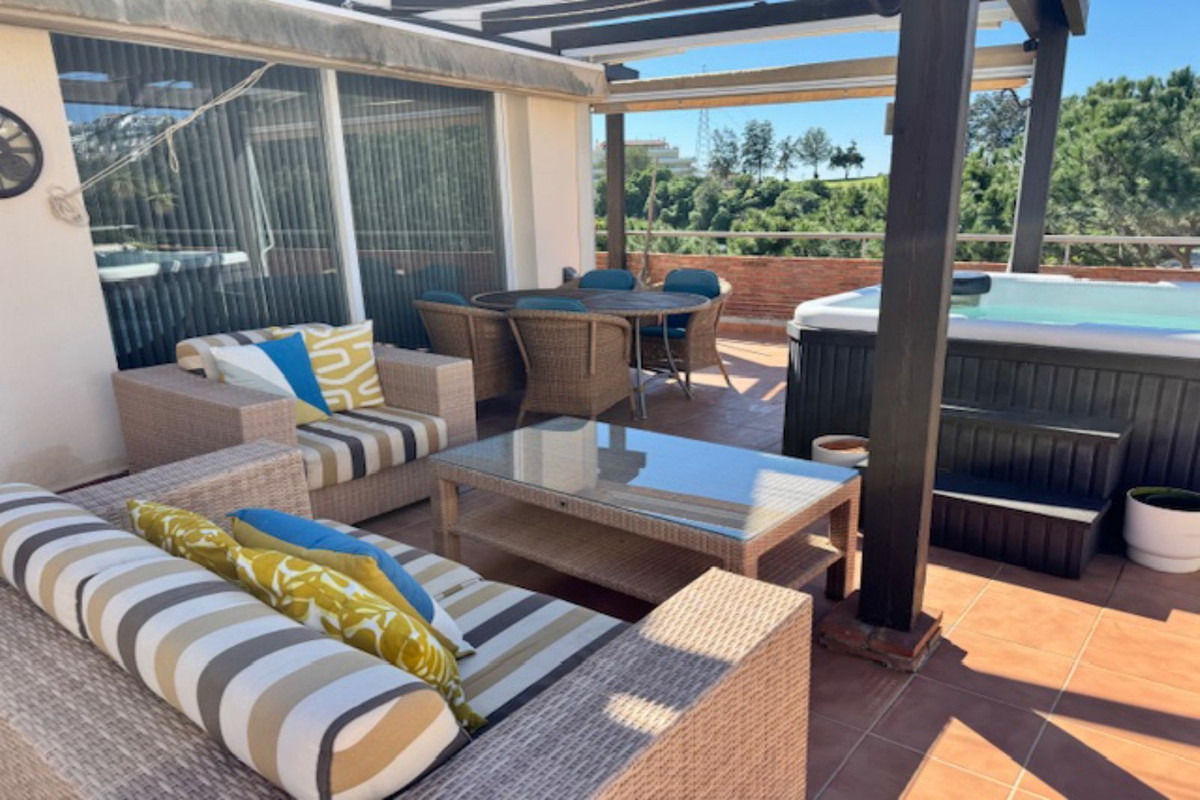 Ez a fényes, szokatlanul nagy 2 hálószobás luxus, délre néző penthouse található az exkluzív, gyönyörűen őrzött, luxus komplexum Riviera del Sol mellett a tekintélyes Miraflores Golf Club House. Az ingatlan áll egy nagyon nagy társalgó / étterem, egy teljesen felszerelt nyitott terv konyha, 2 kétágyas hálószoba, 2 fürdőszoba (egy ensuite) és egy nagy csomagoló körül terasz, amely gyönyörű kilátás nyílik a golf, hegyek és a közösségi kertek. a társalgóban gyönyörű nagy padló mennyezeti üveg terasz ajtók 2 oldalon, és a fő hálószoba nagy tükörrel felszerelt szekrények, valamint terasz ajtók vezető a teraszra. Ez az apartman kész a magas színvonalú, márvány padló egész, teljesen csempézett márvány fürdőszoba, légi con (h és c), video belépési telefon, műholdas tv, riasztó stb Ez a békés komplexum gyönyörű, nagyon jól karbantartott trópusi kertek, amely magában foglalja a víz / tó funkció. Van egy nagy medence, bár előkészítő terület, egy külön gyermek & apos; medence, tornaterem és szauna. a lakás a mélygarázs és a tároló.
