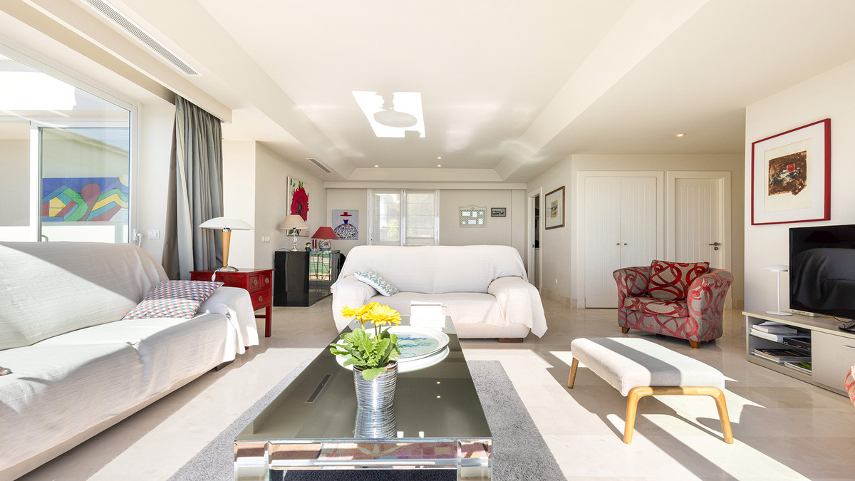 Ez egy gyönyörűen bemutatott három hálószobás penthouse lélegzetelállító tenger, hegy és golf kilátással, található egy dél- után fejlesztés Doña Julia, Casares.