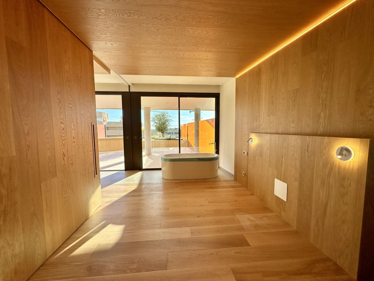 A nappali zökkenőmentesen csatlakozik a fő hálószobához egy elegáns tolóüvegfal segítségével, amely lehetővé teszi, hogy a hely teljesen nyitott egy nagyvonalú, modern érzés, vagy zárt az intimitás, ha szükséges.