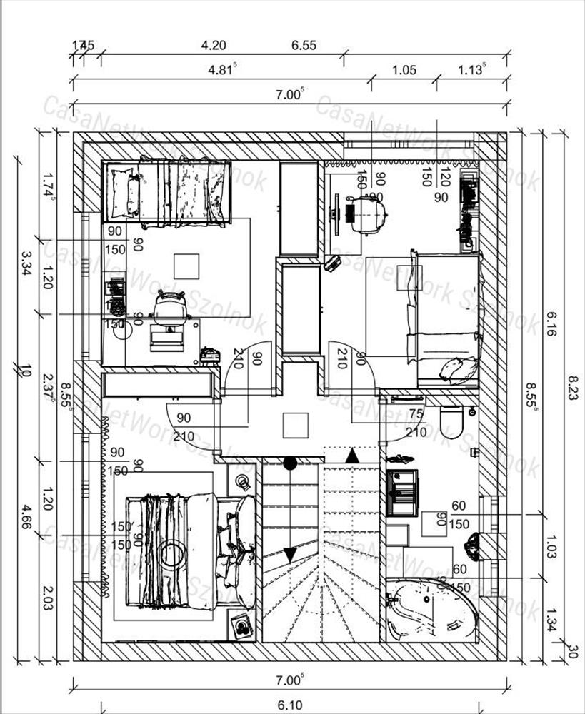 - elosztását tekintve előtér, nappali, konyha-étkező, 3 szoba, 2 db fürdőszoba + wc, közlekedő, terasz