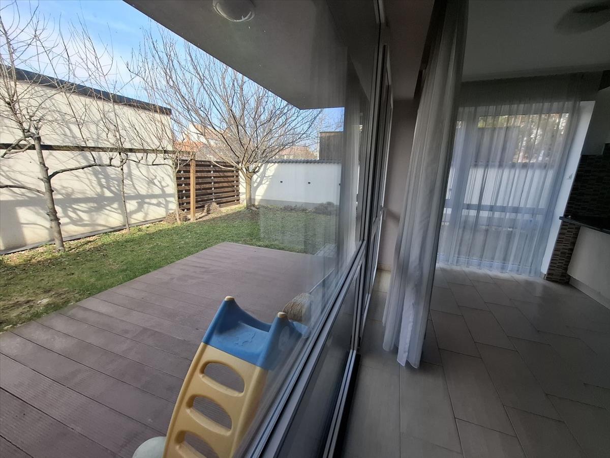 Eladó Csongrád-Csanád vármegyében Szegeden, a kiváló lokációjú Sándor utcában egy 68m2-es, kertkapcsolatos lakás. Az ingatlan egy tíz lakásos társasház részét képezi, azonban nem a lépcsőházban található, hanem az udvarról, teljesen önálló egységként, saját, különálló bejáraton keresztül közelíthető meg. a lakás 2013-ban épült, belső kétszintes. Az alsó szinten egy amerikai konyhás nappali, egy spájz, és egy wc található, az emeleten kettő szoba, és egy fürdőkádas fürdőszoba helyezkedik el. Az emeleten kényelmes erkély, a földszinten terasz kapott helyet. a két emeleti szobában nagyméretű beépített szekrény található. a fűtésről Baxi kazán gondoskodik, a járólappal ellátott helyiségekben padlófűtéses, még a laminált padlóval rendelkező 2 szobában radiátoros hőleadással. a lakásban egy légkondíconáló kapott helyet, de egy másik felhelyezésére is ki lett alakítva a hely. a nyílászárók műanyagok, elektromos redőnnyel, és szúnyoghálóval ellátottak, hatalmas méretűek, műanyagok. a lakáshoz tartozik egy saját, zárható kapun keresztül, vagy a lakásból megközelíthető 92m2-es, füvesített kert. a kertben gyümölcsfák, tulipánfa, és japán cseresznyefa található, ami pazar látványt, és hangulatot biztosít, illetve egy nagyobb méretű szauna is helyet kapott itt. Szintén az ingatlanhoz tartozik egy, a lépcsőházban található 2, 5m2-es, saját tároló, illetve egy udvari parkoló is. a beállót a lakással együtt szeretnék értékesíteni, melynek ára: 3. 500. 000, - Forint. a lokáció prémium, percek alatt elérhető a belváros, vagy a másik irányban a Lidl, Aldi, Penny, Tesco, és számos más fontos létesítmény. Az ingatlan tehermentes, jogilag rendezett státuszú, azonnal birtokba vehető, és egy esetleges tisztasági festést követően beköltözhető. További információért, megtekintésért keressen bizalommal! Dr. Szentesi-Nagy Mariann +36308178813 (hivatkozási szám: m125446) FIX 3% lakáshitelre megvehető