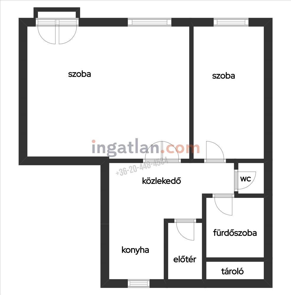 előtér, tároló, két szoba, konyha, fürdőszoba, külön wc.