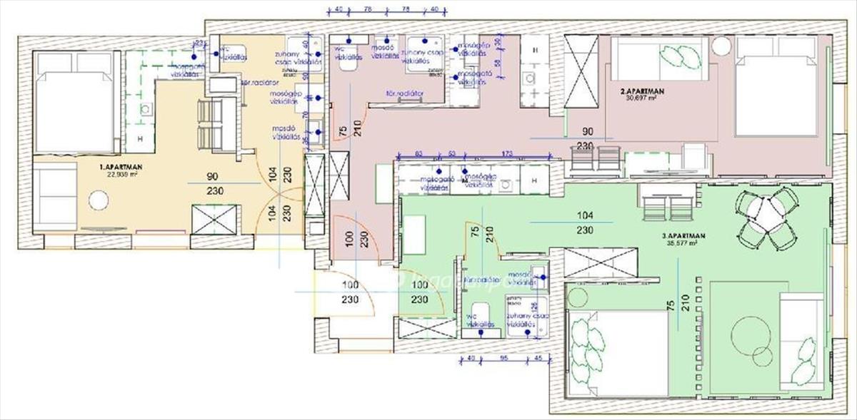 A lakások méretei: 35, 6 nm , 30, 7 nm és 23 nm . Mindhárom ingatlan amerikai konyhás nappalival és saját fürdőszobával rendelkezik. a szobák laminált parkettával, a többi helyiség járólappal burkolt, a fűtést gáz-cirkó biztosítja.