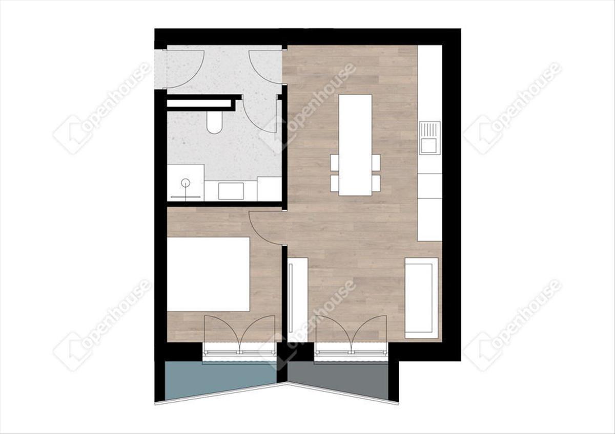 Amerikai konyhás nappali + 1 hálószoba.