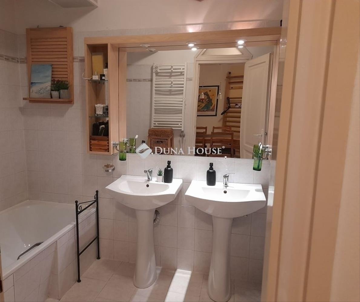 A fürdőszoba valódi komfortzóna: tágas, káddal és zuhanyzóval is felszerelt, dupla mosdóval – a reggeli rohanás itt sokkal gördülékenyebb. a wc külön helyiségben található.