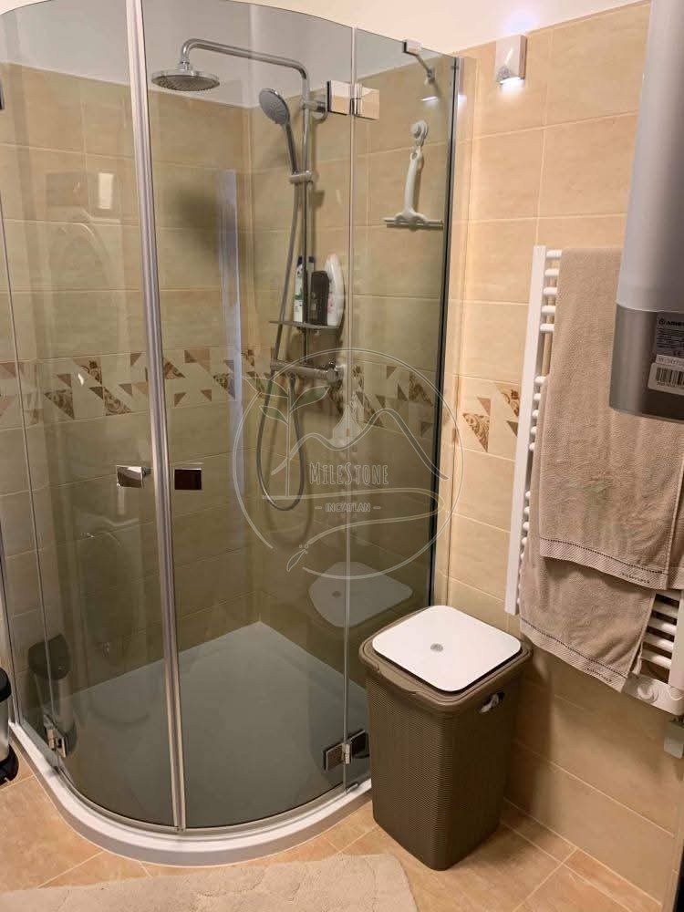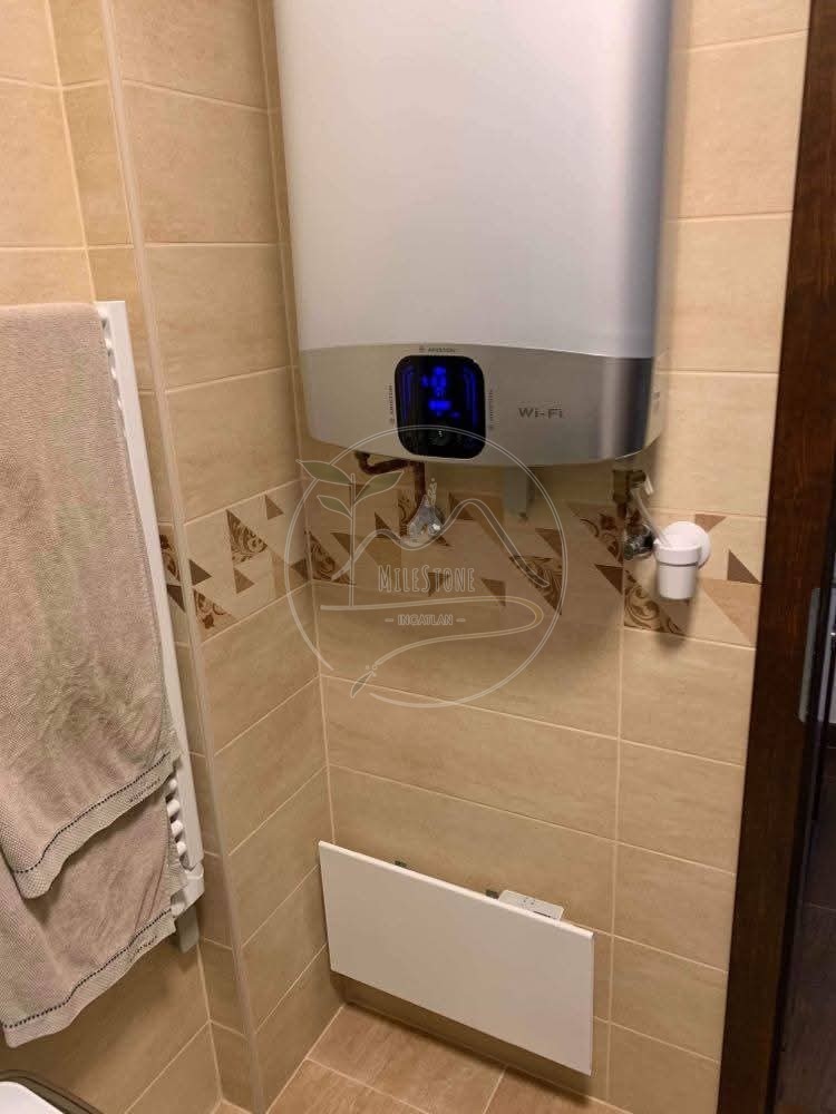 A zuhanyzós fürdőszobában WiFi vezérlésű okosbojler gondoskodik a melegvízről, emellett mosógép és szárítógép is helyet kapott.