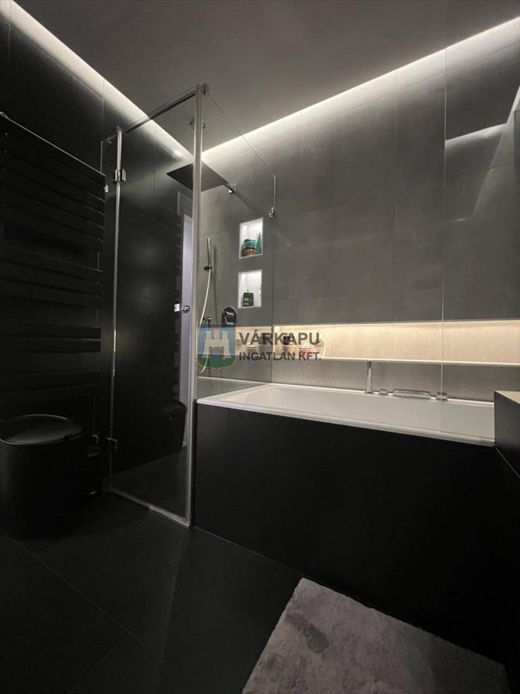 Az ingatlanban külön kiépítettünk egy háztartási helyiséget: itt található a mosógép és a szárítógép, amelyeket egy összeépítő kerettel szereltünk össze. Ebben a helyiségben elfér a porszívó és a mosó/takarító szerek is. a fürdőszobát kiszélesítettük, így befért egy kád és egy zuhanyfülke is: előtét fal mögé épített zuhany szaniter és esőztető funkció. a dekor világítás ugyanúgy megjelenik a fürdőszobában, ahogy a lakás többi helyiségében. Új hideg-, és melegburkolatot kapott a lakás és a terasz, illetve fehér üveg került az erkélykorlátra, így nem látni be az udvarról.