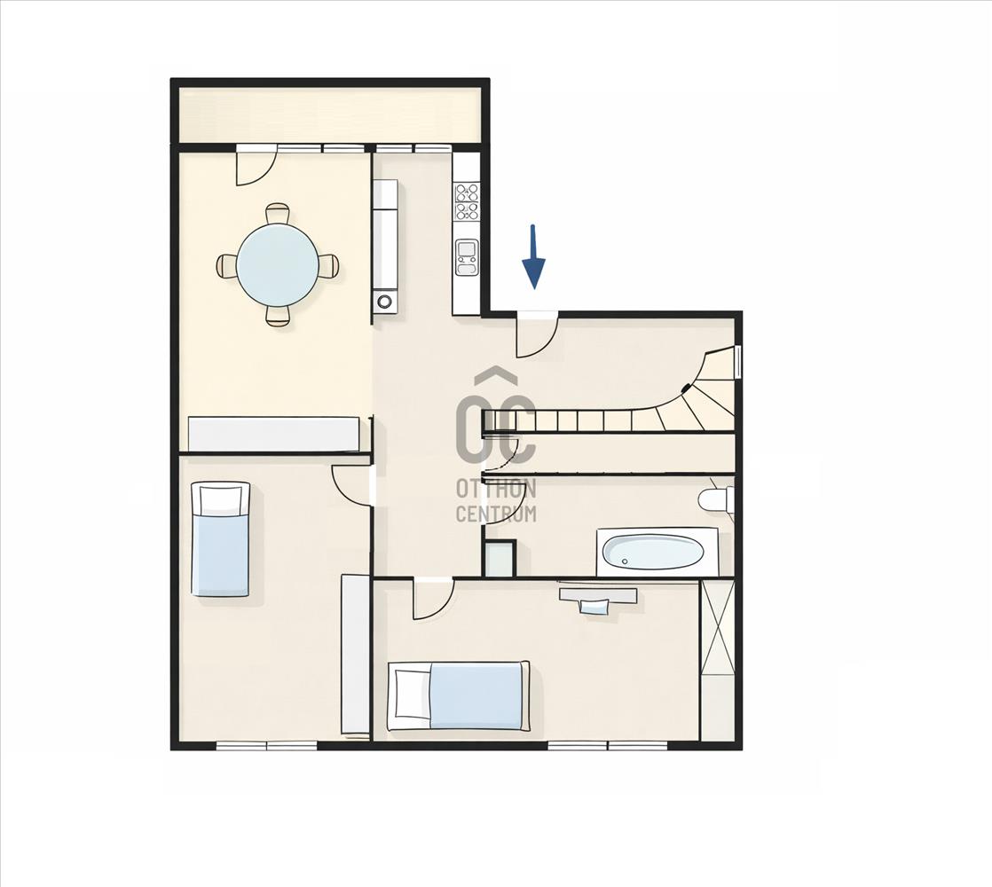 • Földszint: tágas előszoba, konyha, nappali–étkező, kamra, fürdőszoba WC-vel, valamint két világos szoba