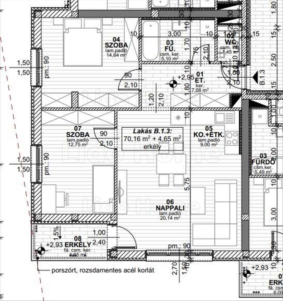 - a lakás 70 m2: Előszoba, amerikai konyhás nappali, 2 db hálószoba, fürdőszoba WC-vel