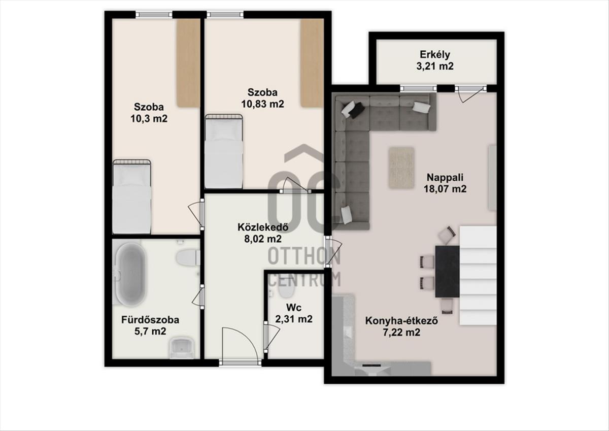 A hirdetésben szereplő lakás 62 négyzetméter lakótérrel rendelkezik, amelyhez kapcsolódik egy 8 négyzetméter alapterületű galéria. a lakás többek között magába foglal egy kényelmes méretű nappali-étkező-konyhát, három hálószobát és egy fürdőszobát.