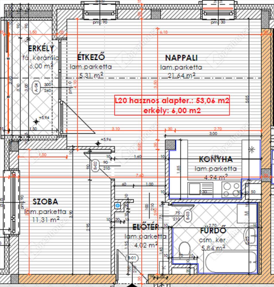 nettó 53, 06 m2-es lakás + 6, 00 m2-es fedett erkély