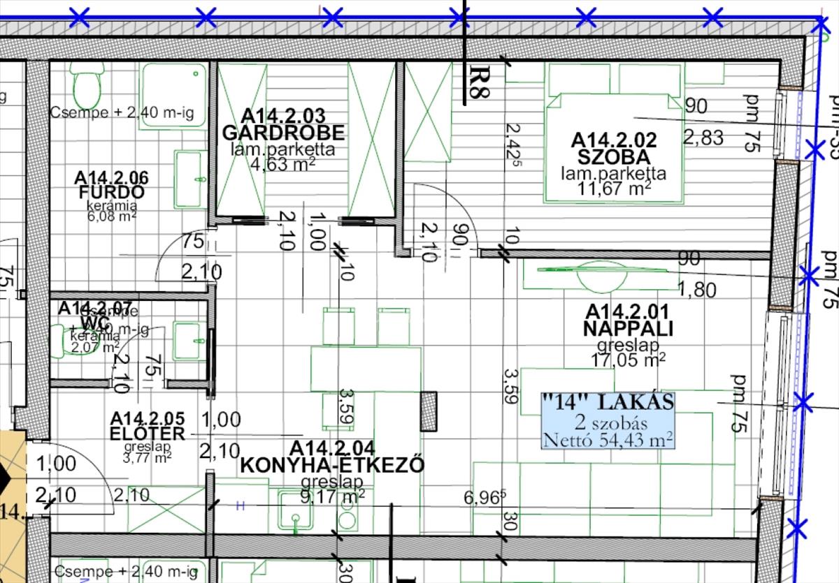 Elrendezés: konyha + étkező – nappali, szoba, gardrób, előtér, fürdő/wc külön helyiségben