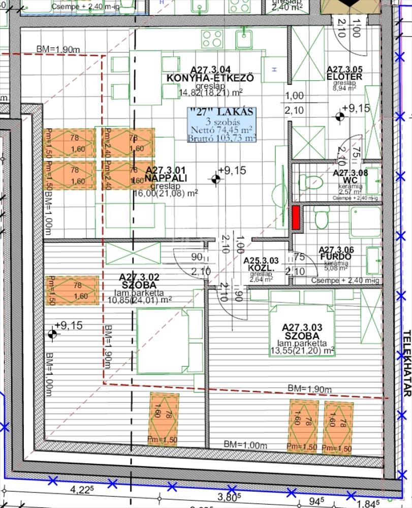 A27 lakás: 74, 45 m2|konyha + étkező - nappali, 2 hálószoba, előtér, fürdő + wc, különálló wc
