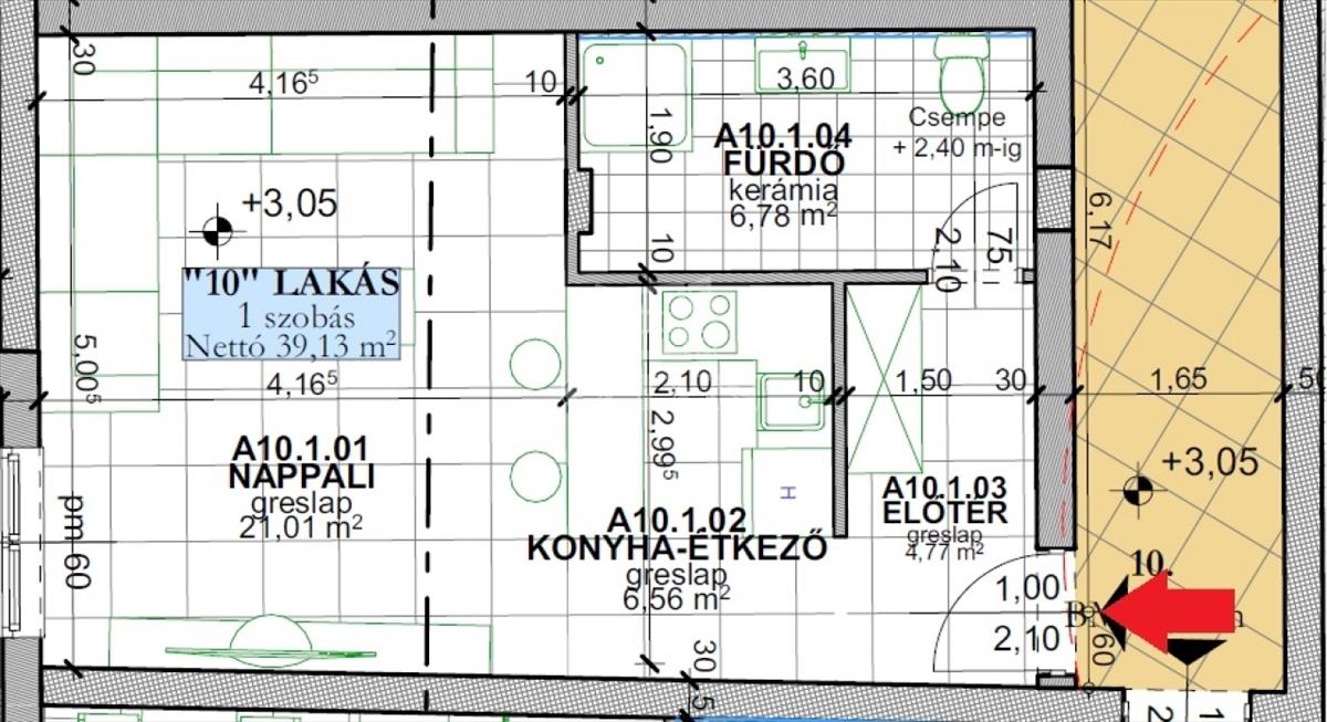 A10 lakás: 39, 13 m2|konyha + étkező - nappali, előtér, fürdő + wc,