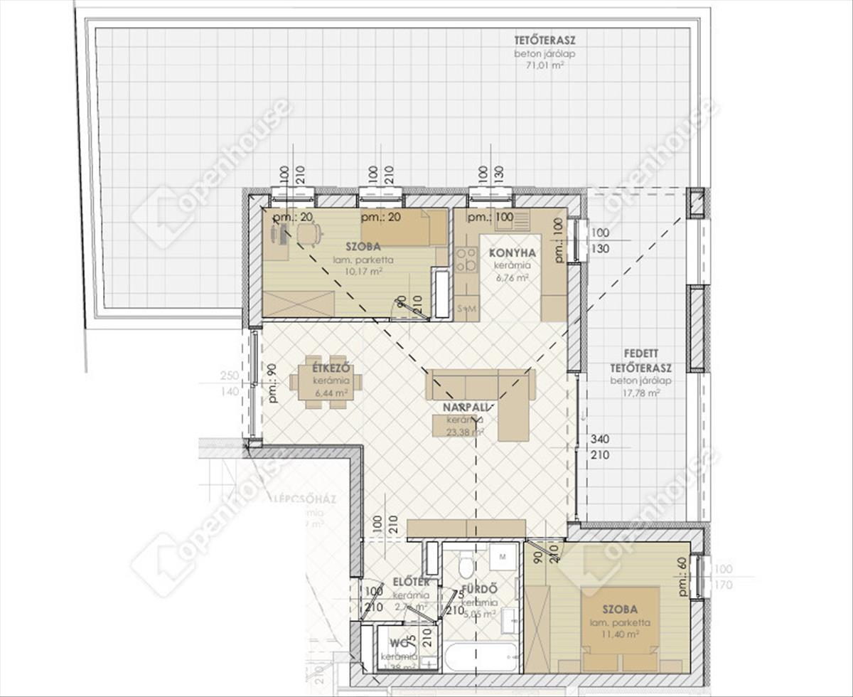 - nettó 67, 34 nm lakótér, 17, 78 nm fedett tetőterasz 71, 01 nm tetőterasz