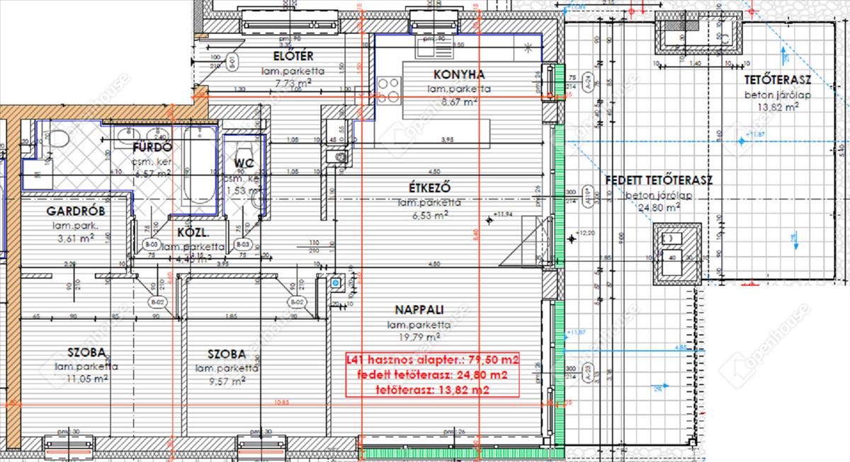 nettó 79, 05 m2-es lakás + 24, 8 m2-es fedett erkély + 13, 82 tetőterasz