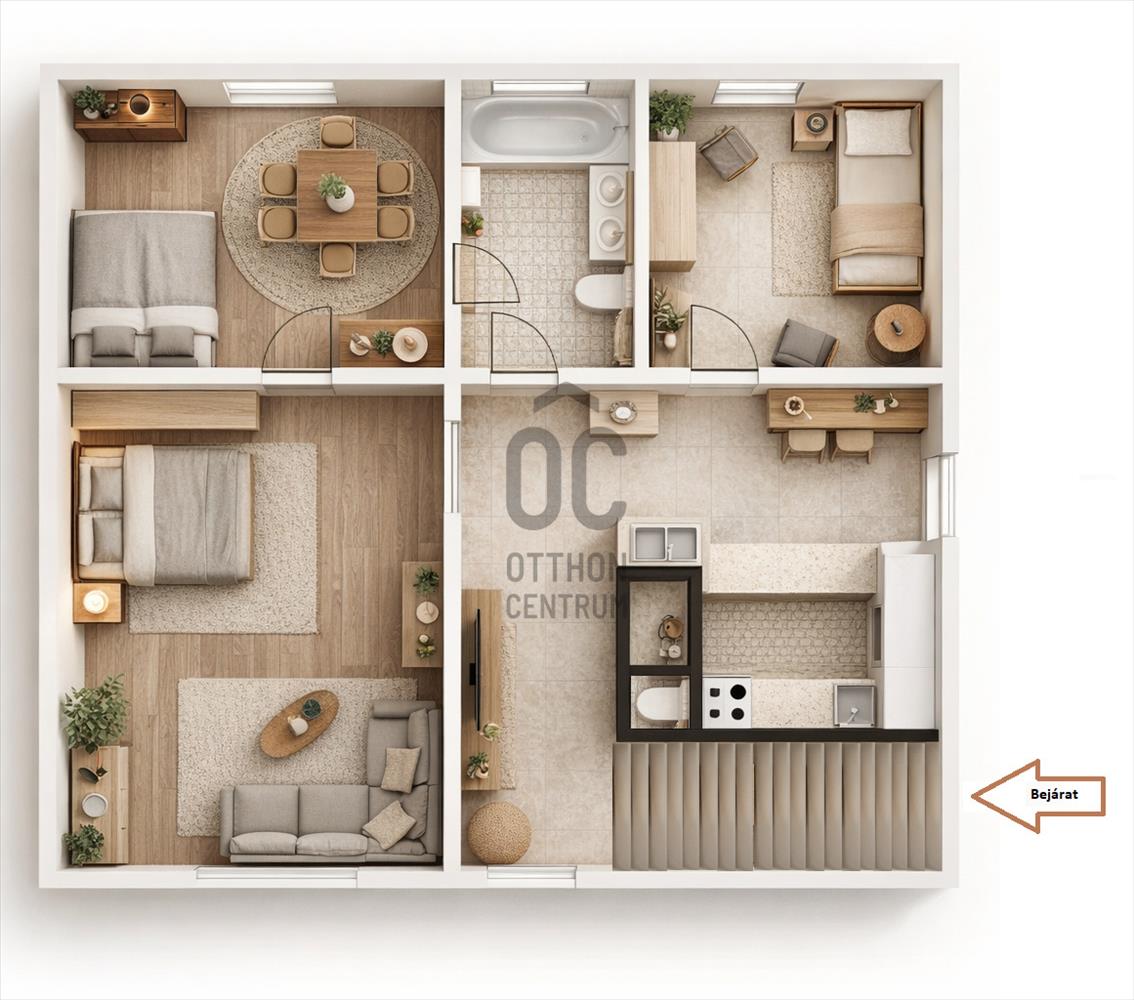 A praktikus elrendezés (nappali + 2 hálószoba, külön wc, tágas fürdő dupla mosdóval) kényelmes, jól élhető otthont biztosít.